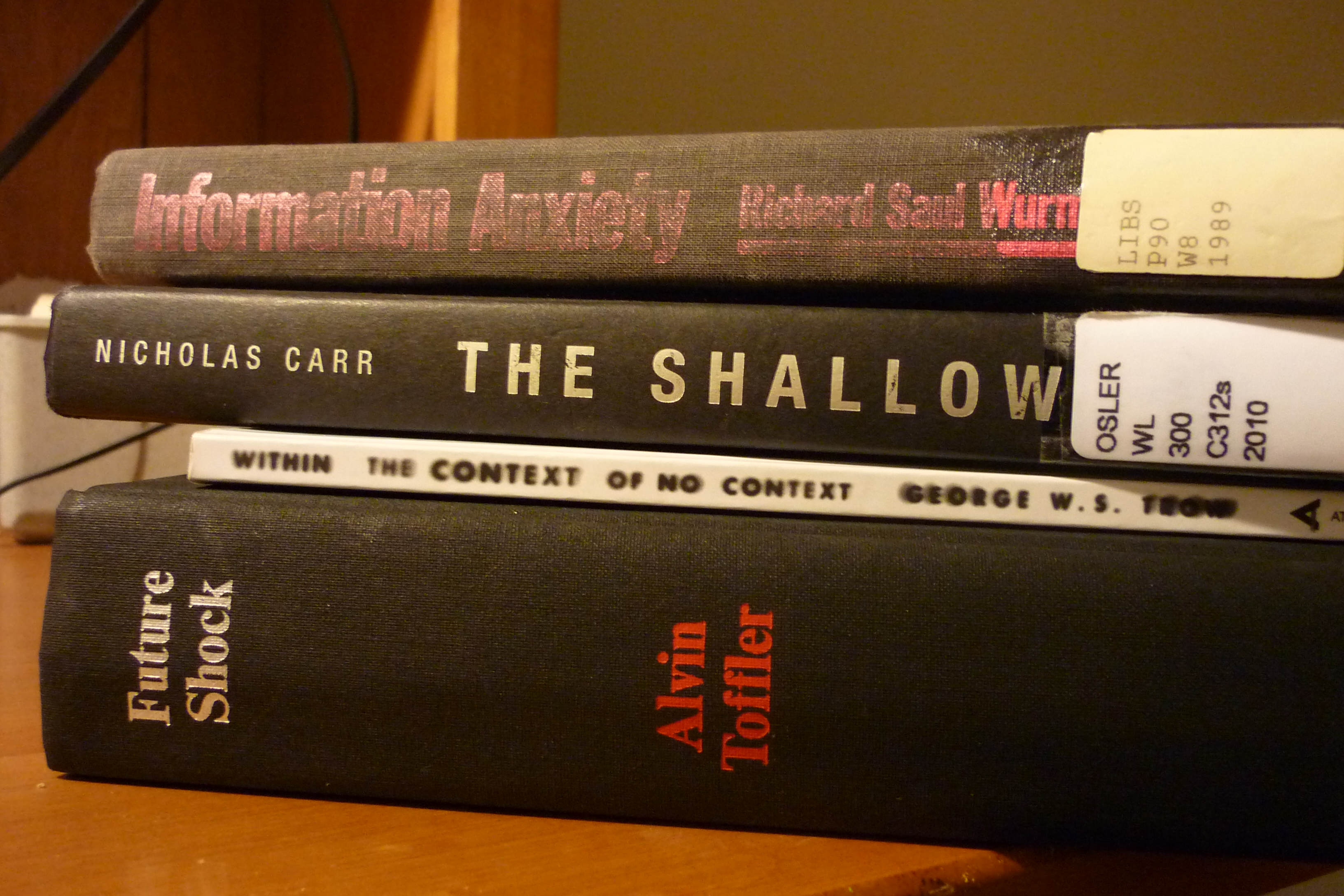Of course, LIS does indeed have a rich history that should receive our attention. What prevents that history’s investigation is that it would mean countless furloughs and tangents into other disciplines, and into the past, not the future, where everyone likes to believe we are heading. Anyways, this blog can be used as a place to draw attention to areas of interest, historical or otherwise, that may be left out of course curricula. (I hope to do so shortly with a discussion of Nicholas Carr’s The Shallows: What the Internet Is Doing to Our Brains, so check back if you’re interested.)